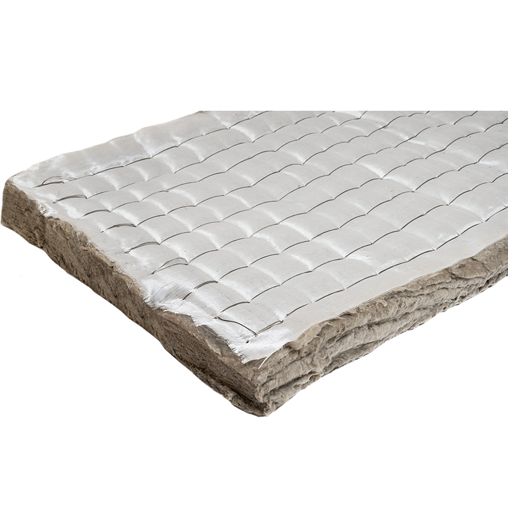 Мат из базальтовых супертонких волокон без использования связующего с диаметром волокна до 3 мкм и длиной волокна до 70 мм, стеклоткань с одной стороны.
