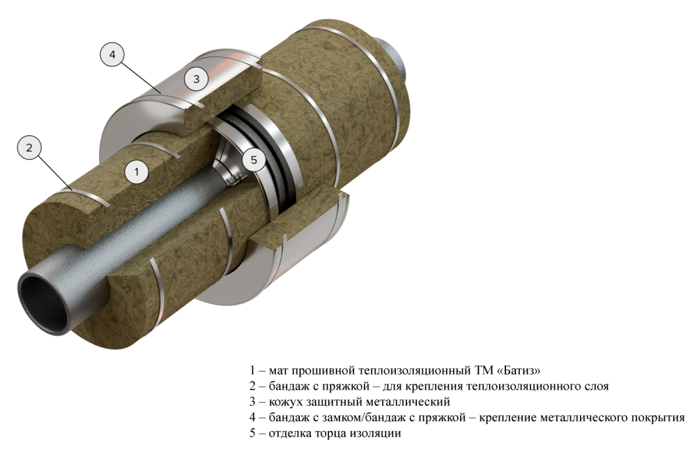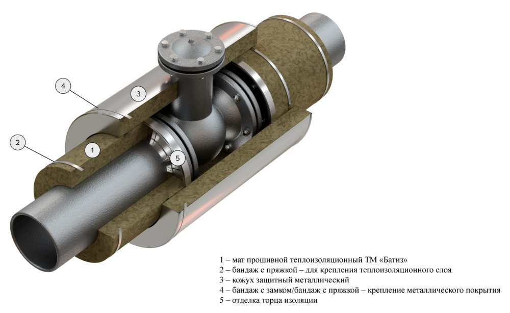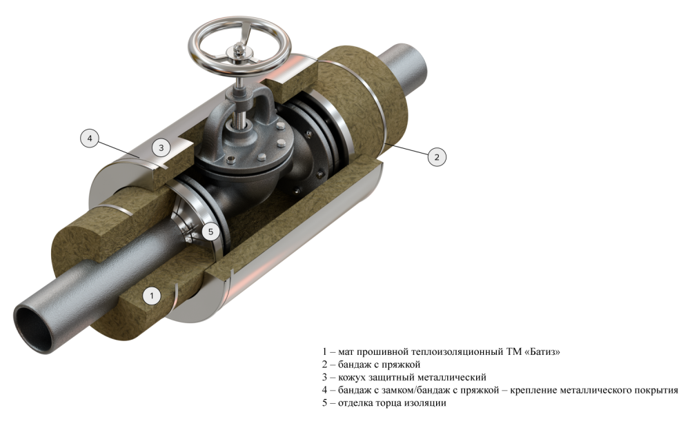 Возможно использование матов ТМ «БАТИЗ» в составе полносборных теплоизоляционных конструкций для изоляции арматуры и фланцевых соединений (футляров или полуфутляров).