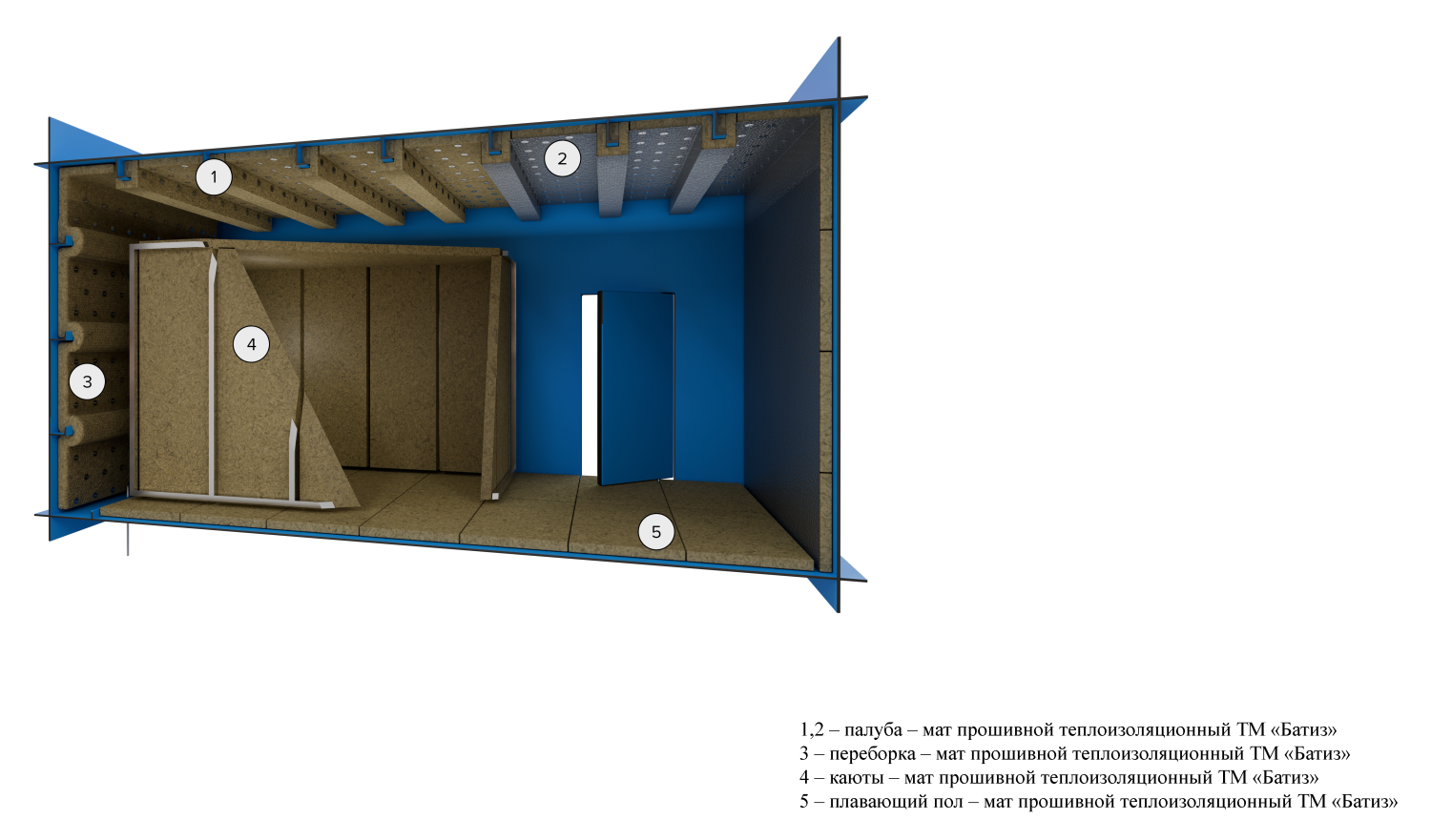 Палубы и переборки, изолированные материалами ТМ «БАТИЗ», обладают не только отличными теплоизоляционными и противопожарными свойствами, но и отличной звукоизолирующей способностью Для обеспечения акустического комфорта на борту судна требуется не только отделка звукопоглощающими материалами в каютах и местах общего пользования, но и изоляция шумных агрегатов на борту судна.